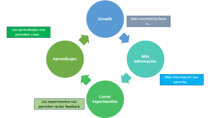 Growth ofrece un enfoque orientado a aprendizajes que en consecuencia traerá más crecimiento. A mas crecimiento, mas información tenemos, lo que nos permite crear hipótesis y correr experimentos, y esto se traducirá en información clave para poder traer más crecimiento.