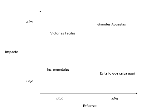 Lo ideal será partir las big bets en proyectos más sencillos que nos permitan mantener el impacto, pero con un menor esfuerzo. Y, evita siempre hacer cosas con alto esfuerzo y bajo impacto.
